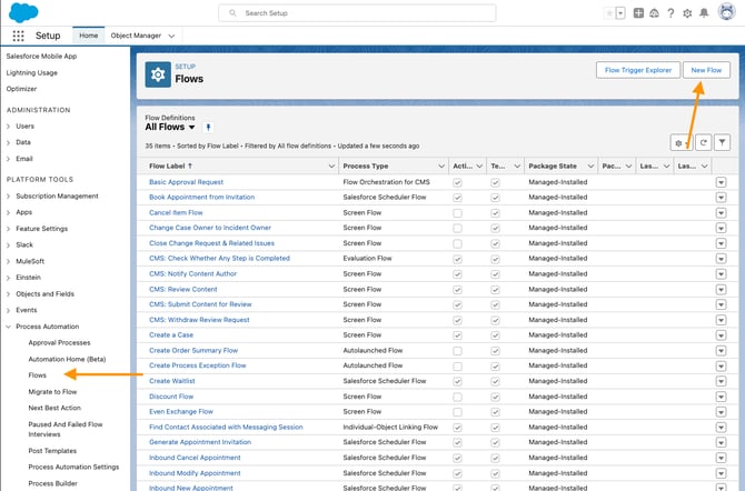2. Select your Avatar in the top-right hand corner of Salesforce. Navigate to Settings --> Home, and select Flows in the "Process Automation" section.