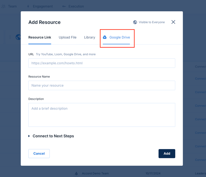 The experience of adding a Google Drive file to an Accord, Playbook, or the Resource library is identical.