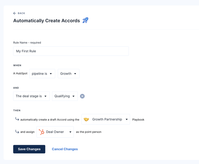 One of the most effective ways to reinforce your repeatable process is by automatically creating an Accord whenever a HubSpot Deal meets certain criteria in HubSpot.