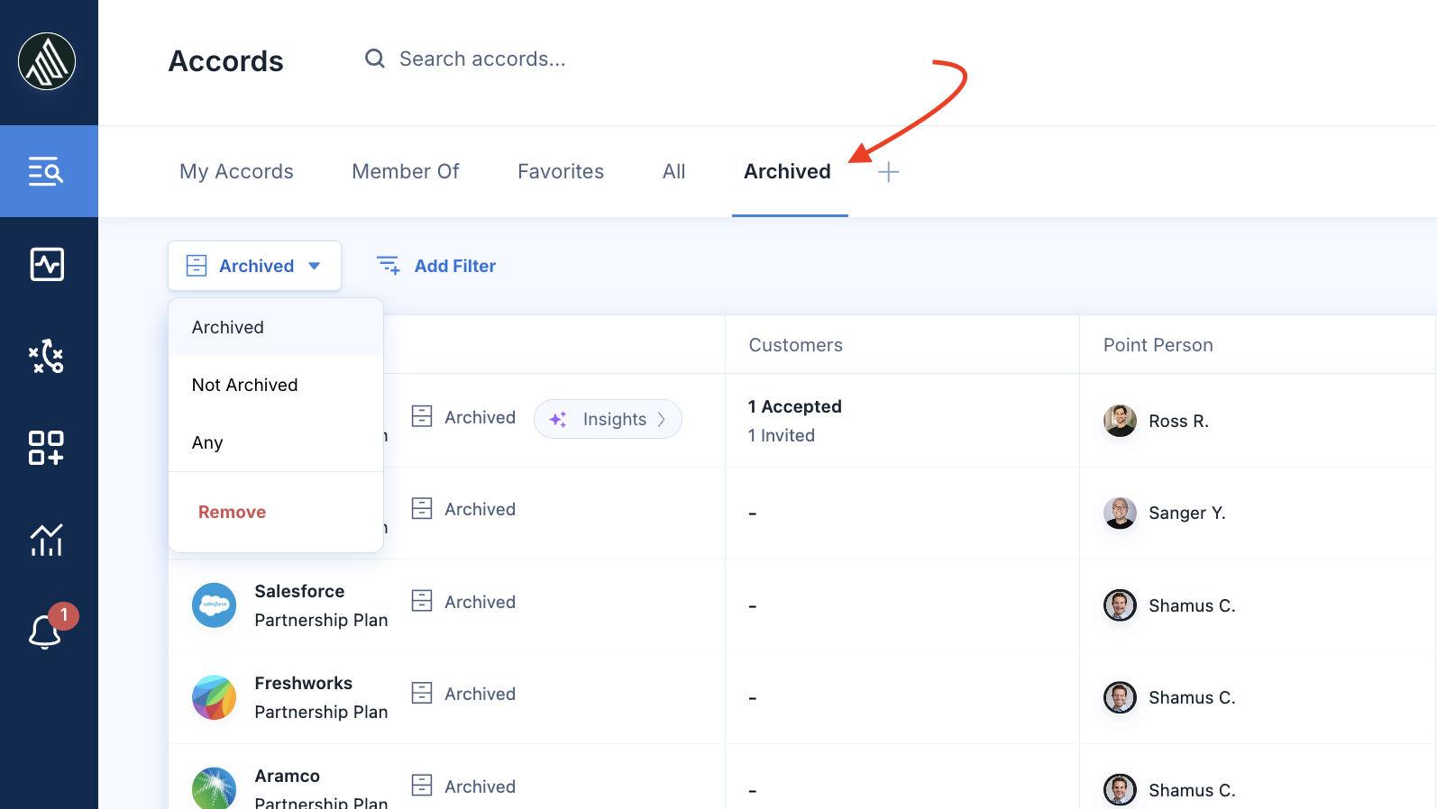 When you are done with an Accord (or you just want to hide it from your views), you have the ability to archive it. Simultaneously, when an Accord is archived, this means that your customers can no longer access it.