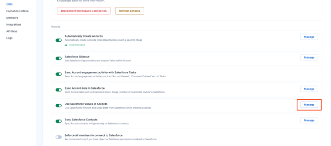 - Click "Manage" in the Use Salesforce Values in Accords line item