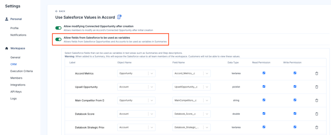 Once you've done that, you should be able to see all of the Salesforce variables that have been configured in your Accord workspace.