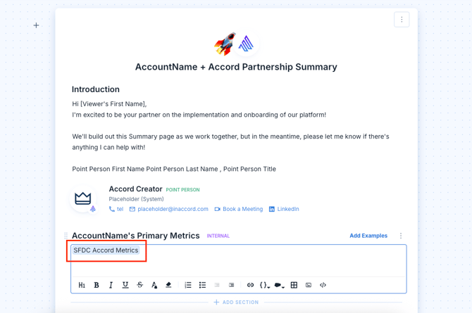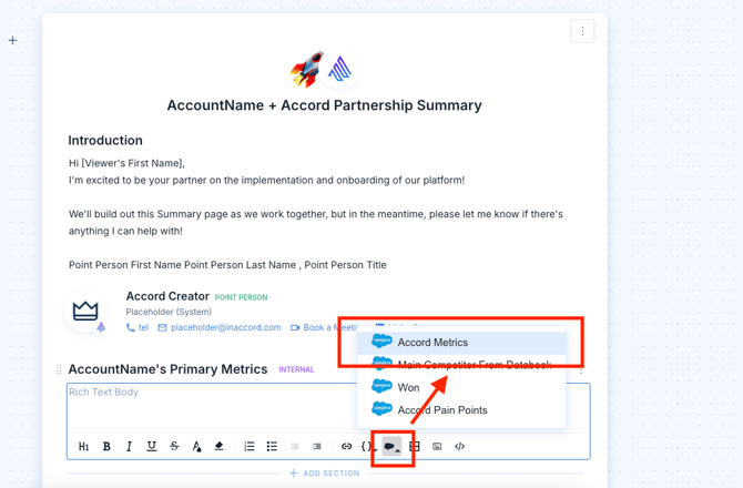 Once the Salesforce variable has been created, it can be used in the Summary page of either Accords or Playbooks.