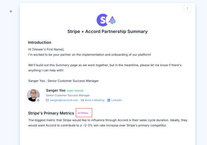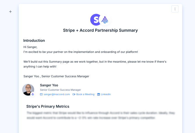 Salesforce variables are connected to fields in your Salesforce instance, and Accord will never expose data from your CRM to external stakeholders. Therefore, if the value of a Salesforce variable is in a customer-facing section of your Summary page, they will appear blurred out. Here's what the same Summary page for your customer might look like: