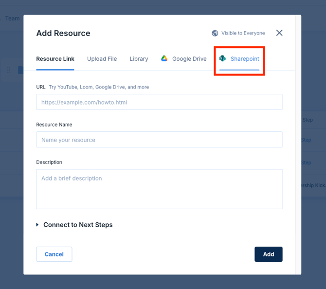 - Select SharePoint on the top navigation bar of the "Add Resources" modal