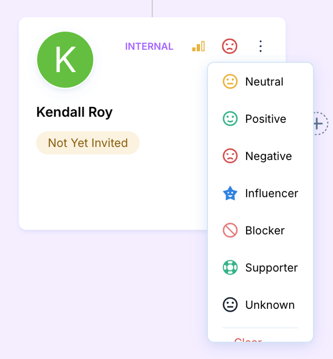 Once set, the sentiment badge will be visible on the Stakeholder Map (but never your buyer), giving you a quick visual indicator of each stakeholder's disposition toward your solution.