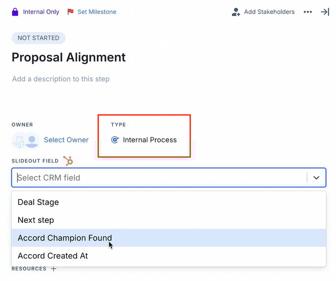 Your Accord instance must be integrated with your CRM in order to link an Internal Process Step with a CRM field. View our integration setup instructions, linked below: